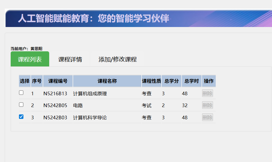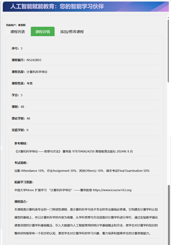 (2)课程资源模块:每门课程,教师可以上传 大纲、进度表、作业、知识图谱、线上学习资源等课程资源,并可以在每学期进行更新;
