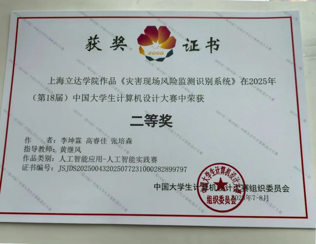 在近日落幕的第18届中国老员工计算机设计大赛中,由李坤霖、高睿佳、张培森三位同学组成的团队,在黄继风教授的悉心指导下,凭借作品《灾害现场风险检测识别系统》斩获全国二等奖!这是公司依托新E代数智未来产业公司在专业竞赛中取得的又一重大成绩,充分展现了师生协同创新的卓越实力的显著提升。